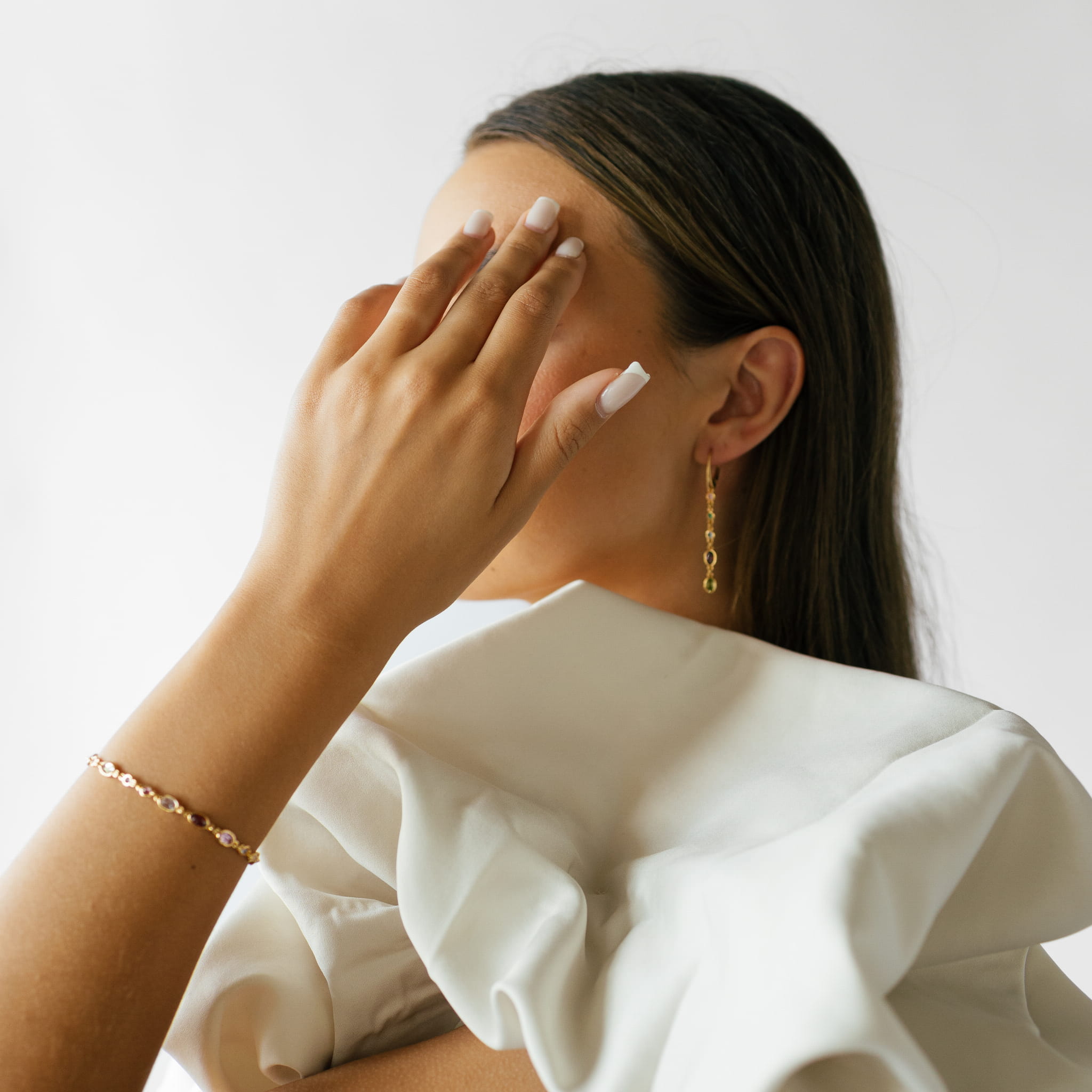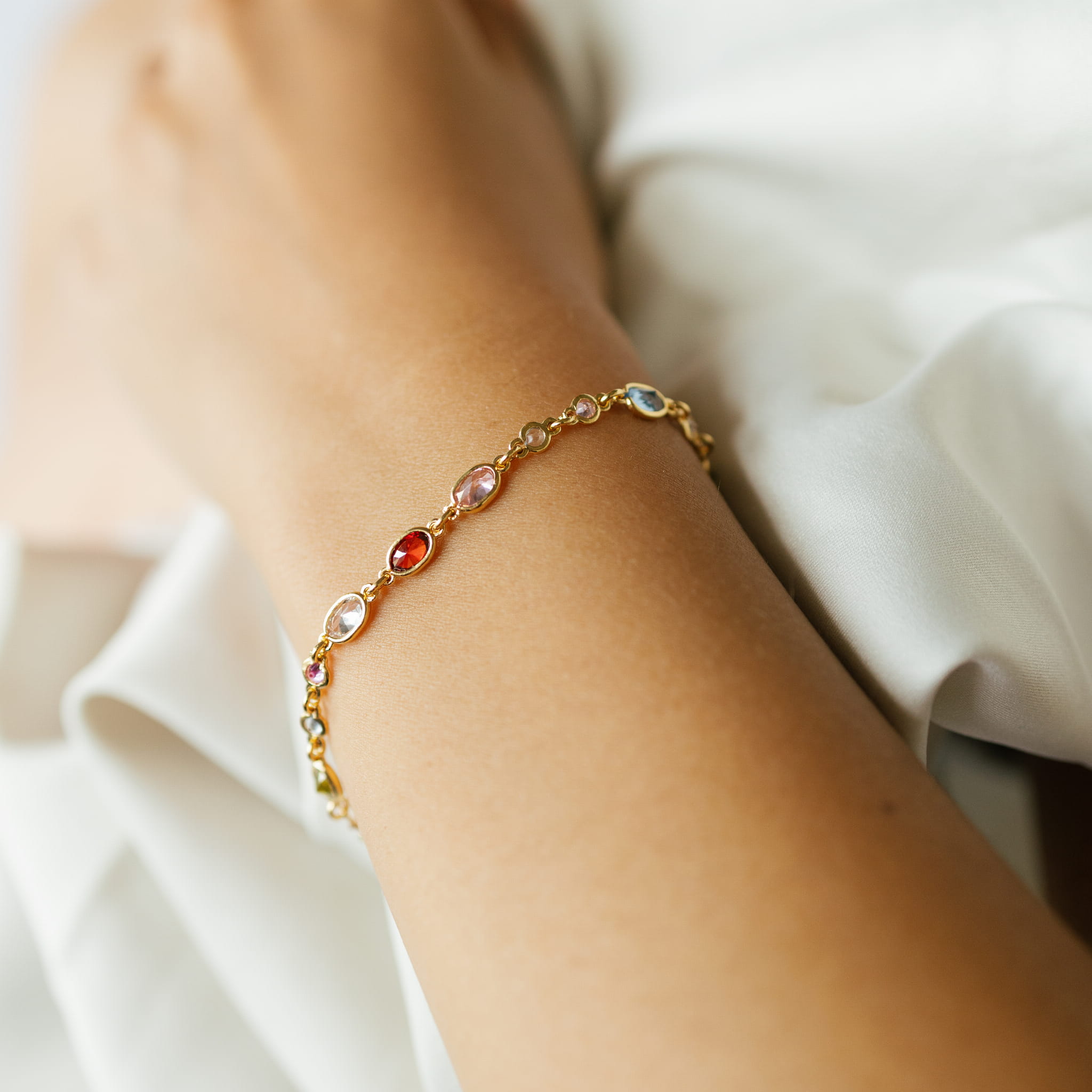 Bransoletka wykonana z najwyższej próby srebra 925, pokryta warstwą 24K złota, to wyjątkowy dodatek, który zachwyca swoim pięknem i precyzyjnym wykonaniem. Składa się z 9 owalnych i 8 okrągłych elementów, wypełnionych lśniącymi, kolorowymi cyrkoniami.