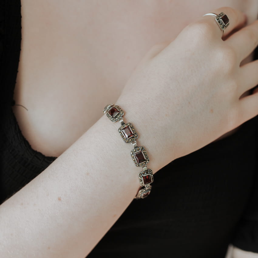 Bransoletka srebrna z czerwonymi cyrkoniami i markazytami prostokątna