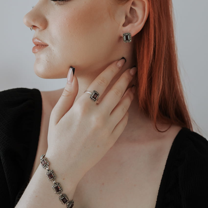 Poznaj naszą wyjątkową kolekcję biżuterii srebrnej pr. 925 z czerwonymi cyrkoniami i markazytami, gdzie klasyczne wzory łączą się z nowoczesnym designem. Każdy element jest unikalny, co sprawia, że jesteśmy jednymi z nielicznych w Polsce, którzy tworzą takie arcydzieła.