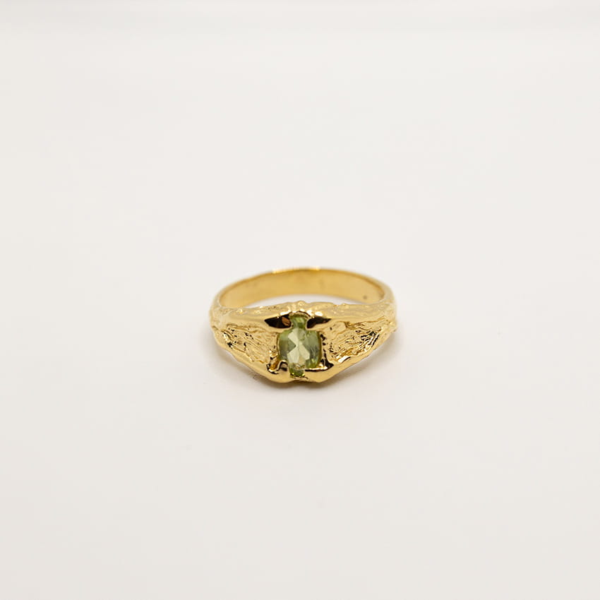 elegancki pierścionek z peridotem · pierścionek srebro 925 pozłacane · ręcznie robiony pierścionek · pierścionek Molten Beauty · biżuteria artystyczna · srebro · pierścionek z peridotem