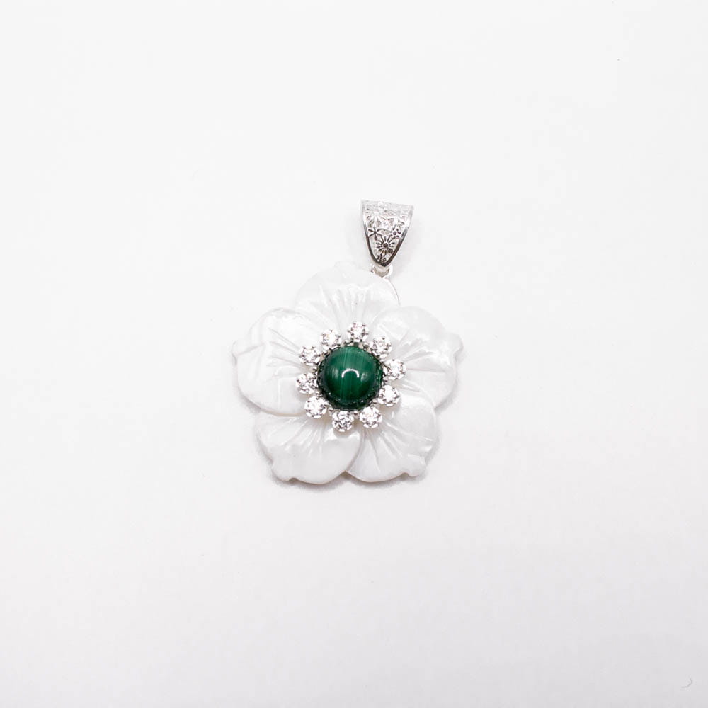 Zawieszka srebrna pr. 925 z masy perłowej w kształcie kwiatka, środek naturalny malachit i cyrkonie.