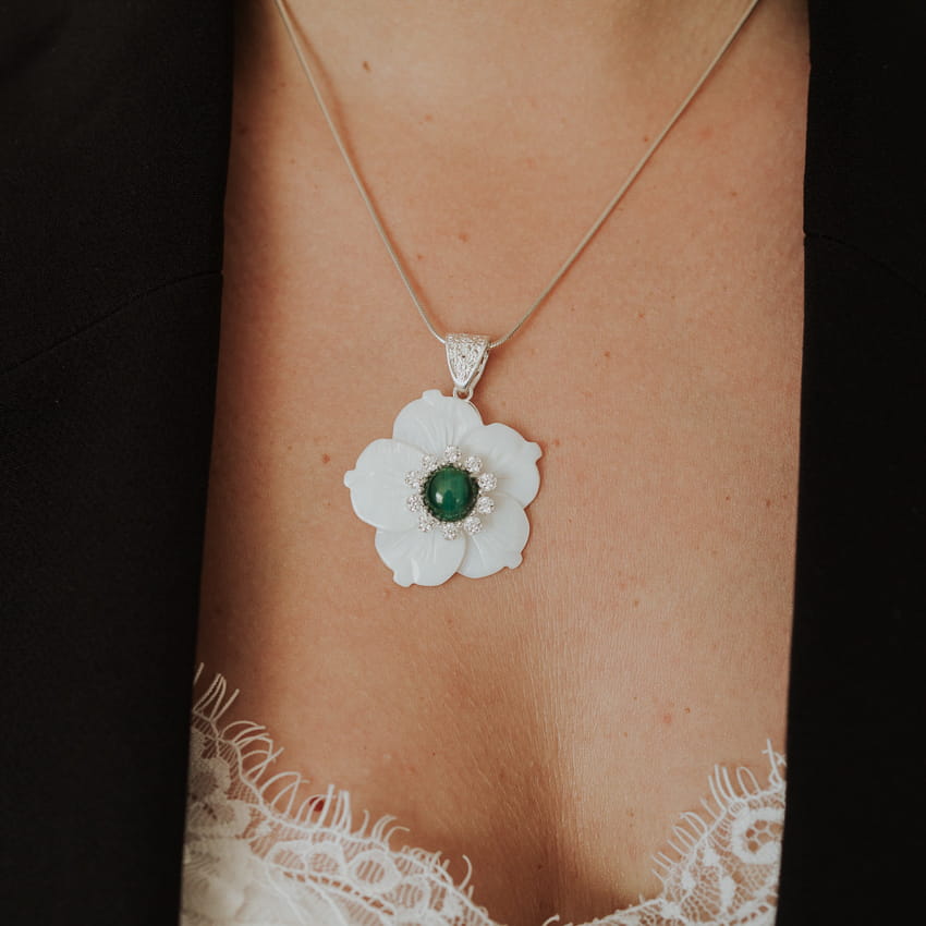 Zawieszka w kształcie kwiatu wykonana z masy perłowej to elegancki dodatek, który zachwyca subtelnym blaskiem i naturalnym pięknem. W centrum kompozycji znajduje się intensywnie zielony malachit, który przyciąga wzrok swoją głębią koloru i niezwykłą strukturą. Drobne zdobienia wokół kamienia nadają zawieszce wyjątkowego charakteru i luksusowego wyrazu. Idealna zarówno na co dzień, jak i na specjalne okazje, doskonale podkreśli Twoją unikalność i styl.